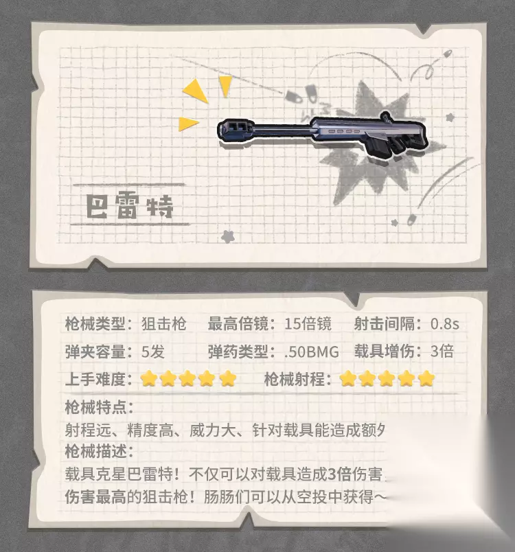 巴 雷 特在香肠派对中是一把连狙,品质为金色,原型为M82A1。伤害非常高!对载具有特殊伤害,增伤3倍!只能在超级空投或空投中拾取,每次拾取的子弹数为15发。