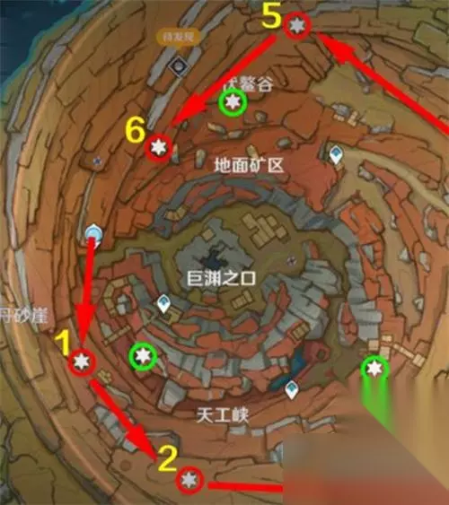 原神三枚老石位置在哪 三个老石在磐键旁边(绿圈),剩下六个老石在悬崖上(红圈),采集完磐键旁边的3个老石后,顺着1号老石沿着悬崖走逆时针采集一圈,就能收集全部老石了。