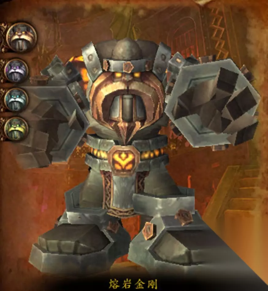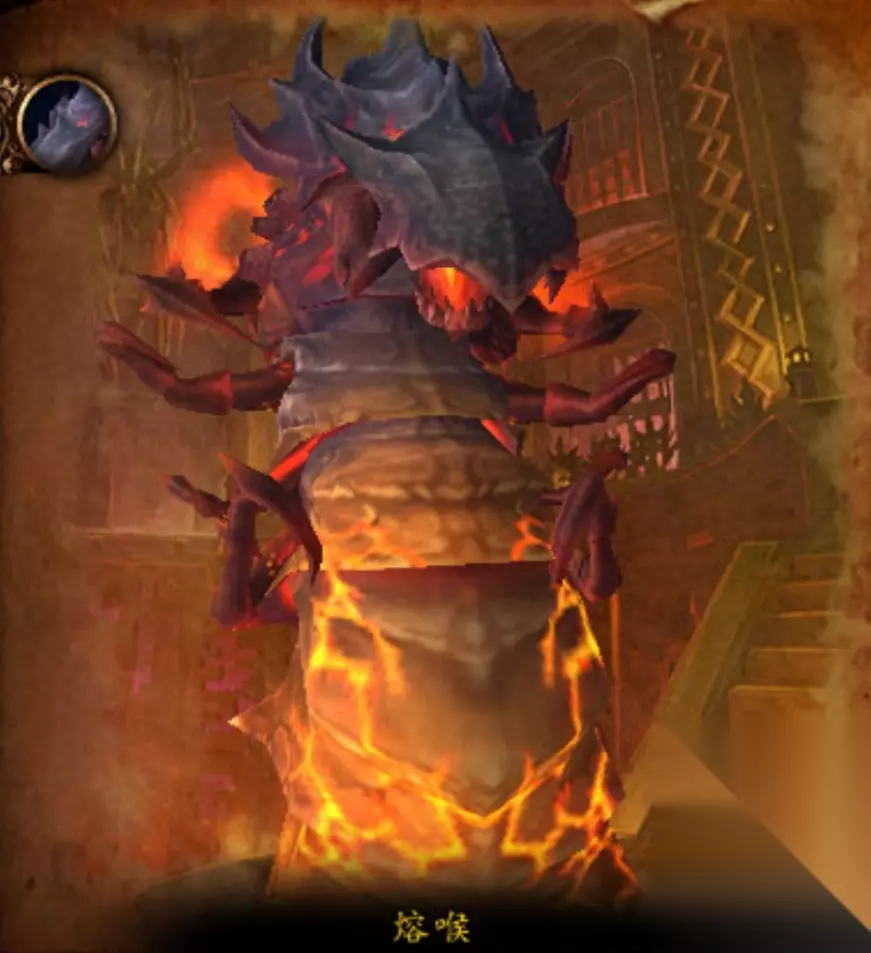 《熔喉》一只巨大的岩浆虫。几个世纪前,它被拉格纳罗斯的黑铁奴仆们从火焰之地召唤出来。一开始奈法利安觉得熔喉不过是只麻烦的害虫,不过后来他养成了一个特别的习惯……用这头畜生来处理失败的试验品……