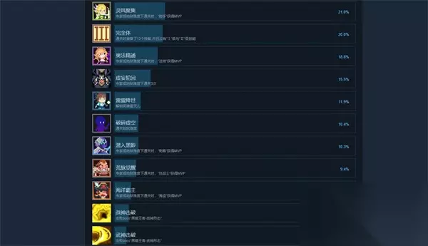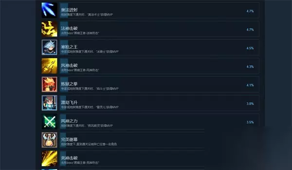 25、风神击破 击败boss「黑暗王者-风神形态」。 26、炼狱之拳 专家或地狱难度下通关时,「焰斗士」获得MVP。 27、渡劫飞升 专家或地狱难度下通关时,「雷灵儿」获得MVP。 28、风神之力 地狱难度下通关时,「疾风箭灵」获得MVP。 29、完美谢幕 地狱难度下,直到通关没有阵亡任意一名角色。 30、死神击破 击败boss「黑暗王者-死神形态」。 31、暗影突袭 地狱难度下通关时,「无影忍者」获得MVP。 32、冰龙寒枪 地狱难度下通关时,「寒枪领主」获得MVP。 33、黑暗终结 地狱难度下击败5位不同的黑暗王者。