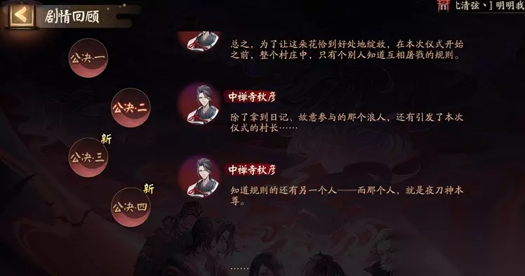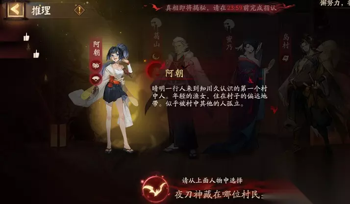 1、答案:夜刀神藏在阿朝身体里,选择阿朝即可 2、分析:需要找出夜刀神藏在谁的身体里,没有之前那么明显的线索,但是看完整个剧情回顾之后,我觉得是阿朝 3、图片里中禅寺秋彦说的话排除了岛村外,被公决的也只有阿朝了