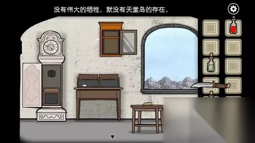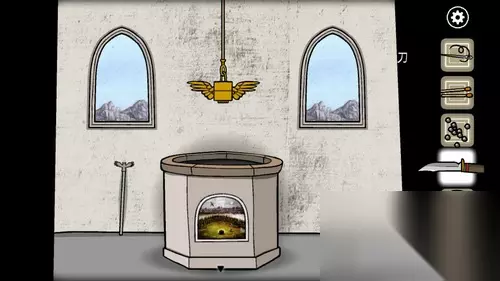 4.到石室里,在桌子上找到针线和两根火柴,纸张的提示是钥匙在神殿的水池里。