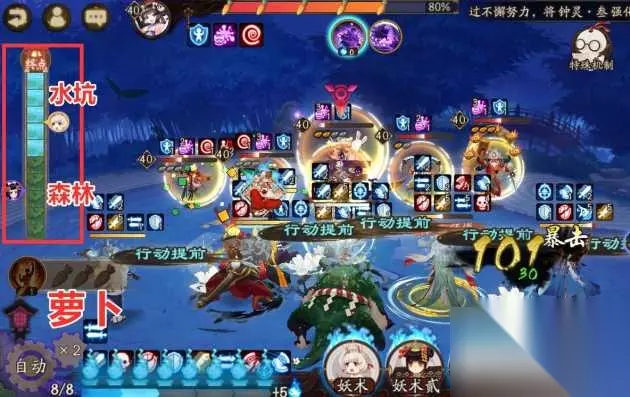 “7层以上机制引起重视” 该副本从第八层开始,就进入了以机制为主的情况,换句话说没办法在通过一路莽的情况去通关,那么我们先来了解一下副本机制究竟是什么?玩法主题是赛跑,当我们进入战斗后最左侧会有孟婆与山兔的进度条,代表我方的山兔在通过森林场地时会提高速度;相反孟婆则在水坑中穿行时会获得收益。