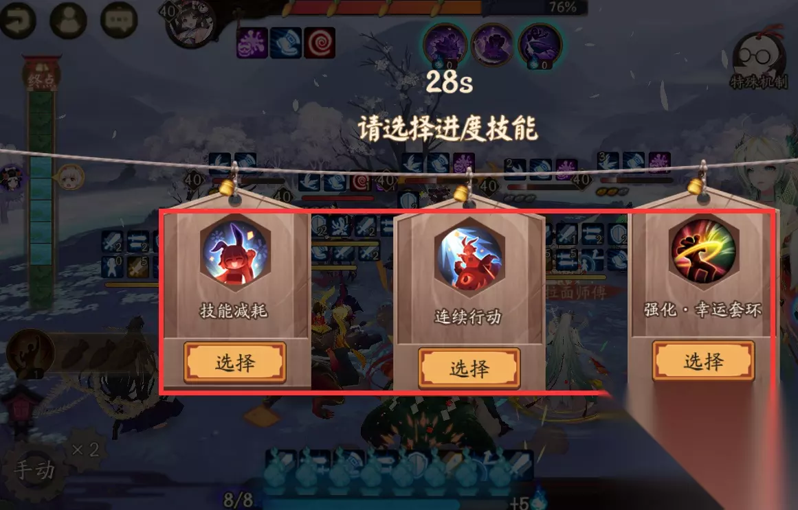 正常情况下,当凑齐三根之后在使用技能最划算,可以直接让山兔前进一格单元格。需要注意,当我们使用萝卜后会立刻跳过当前正在行动式神的回合!接下来就是赛道中途的增益buff,副本共有两次选择增益的节点,且只在山兔行动时才会触发效果 节点1:山兔行动时获得6点鬼火;拉条30%;驱散所有友方一个减益效果 节点2:山兔行动时获得持续一回合的buff,耗火变成0;回合数+1;套环命中提高