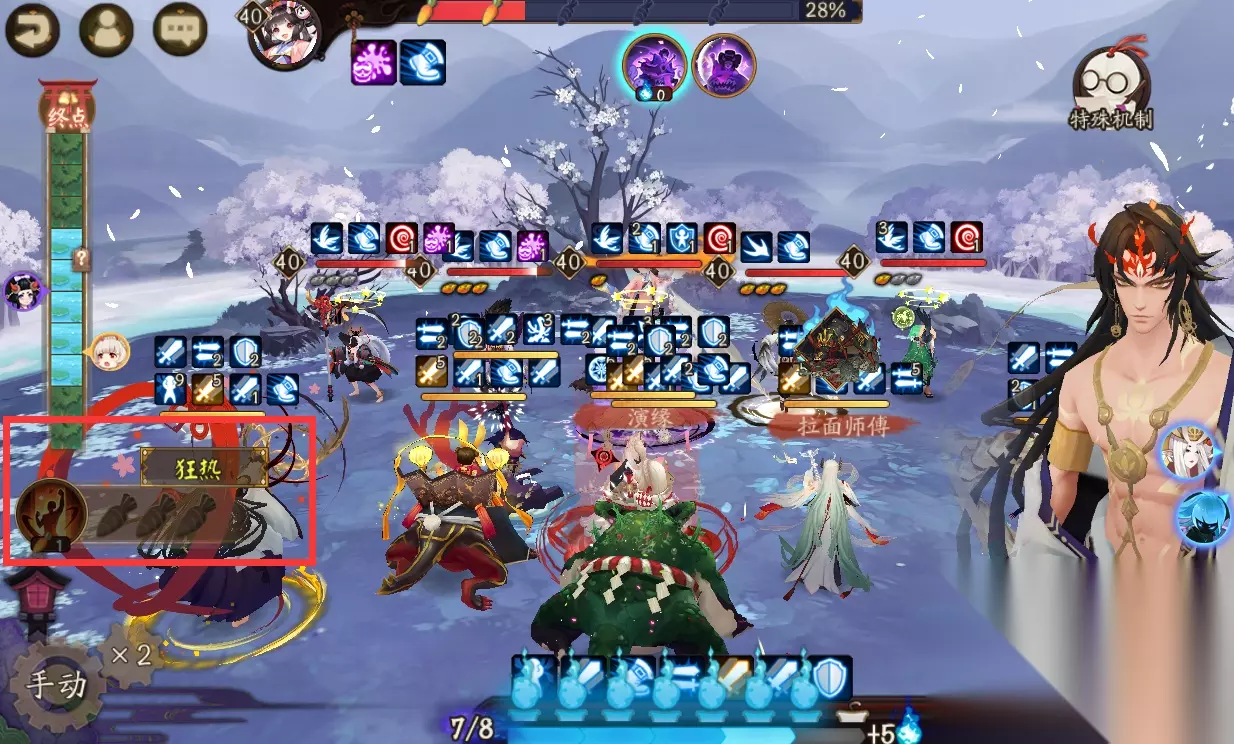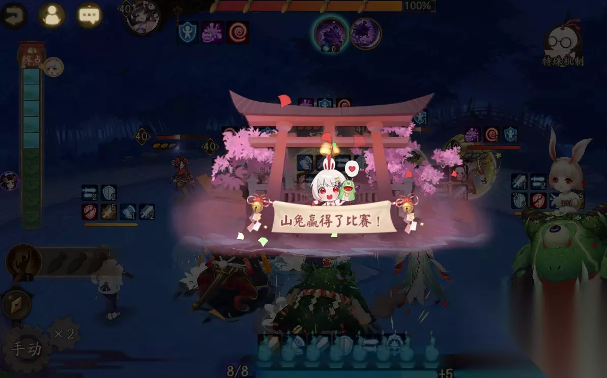而打法也无需动脑,开局让千姬放下锤子后立刻切换至普攻,接下来手动把绿色标记交给我方紧那罗,红色标记交给敌方孟婆,然后挂机欣赏山兔与孟婆的赛跑即可!至于敌方单位的输出我们完全不用顾虑,因为副本机制的关系,全部战场中的式神都不会阵亡,即便血量归零也只是陷入一回合的眩晕状态,并立刻恢复至满血。