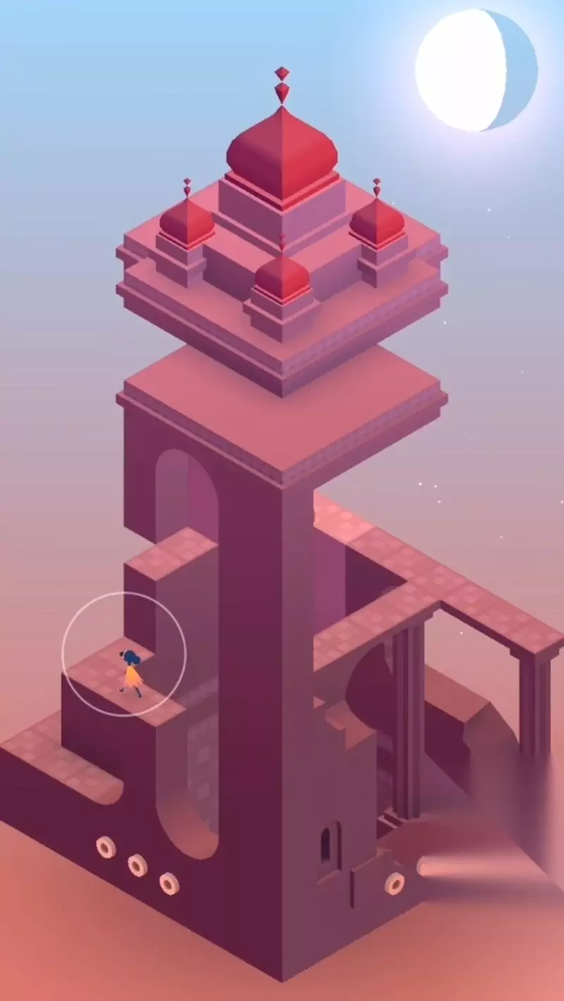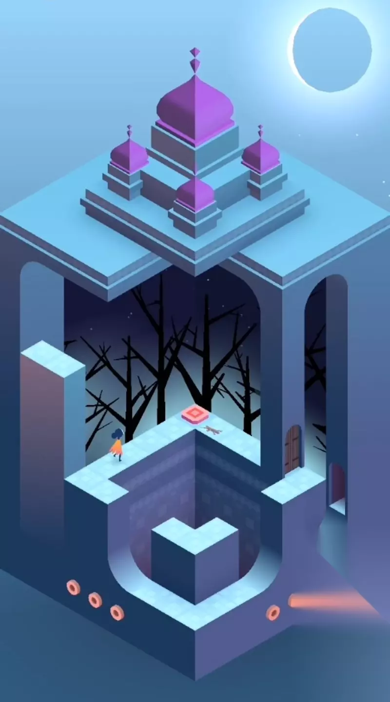 昼夜交替的第三个场景充满诗意,需要通过建筑的整体旋转来调整位置。当萝尔到达特定位置后,再次转动建筑使其能够触碰粉色按钮。第四个场景则要利用两孔移动墙,通过上下移动帮助萝尔进入门内。