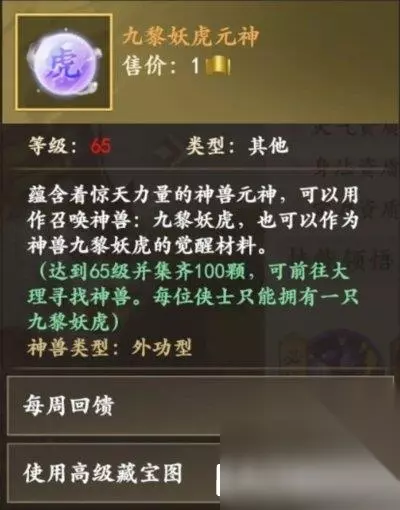 2、九黎妖狐: 通过每周回馈和挖高级藏宝图获得九黎妖虎元神,集齐100个召唤。