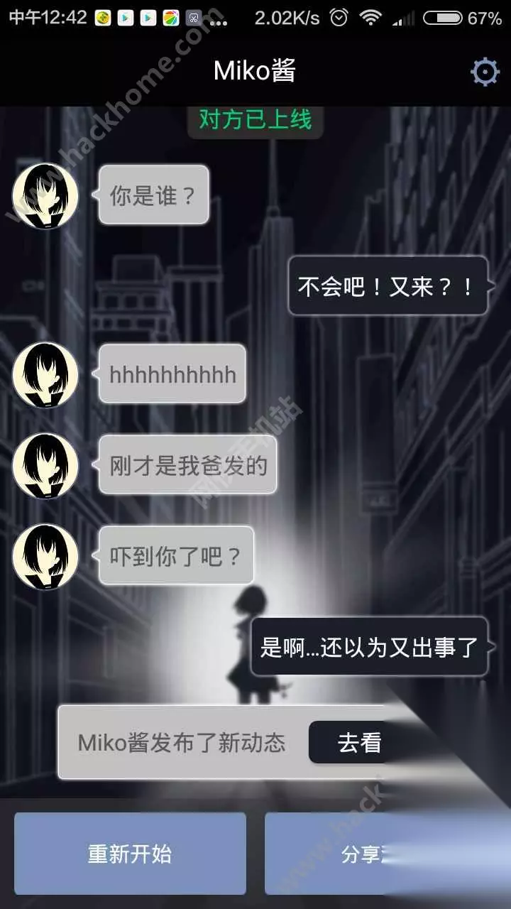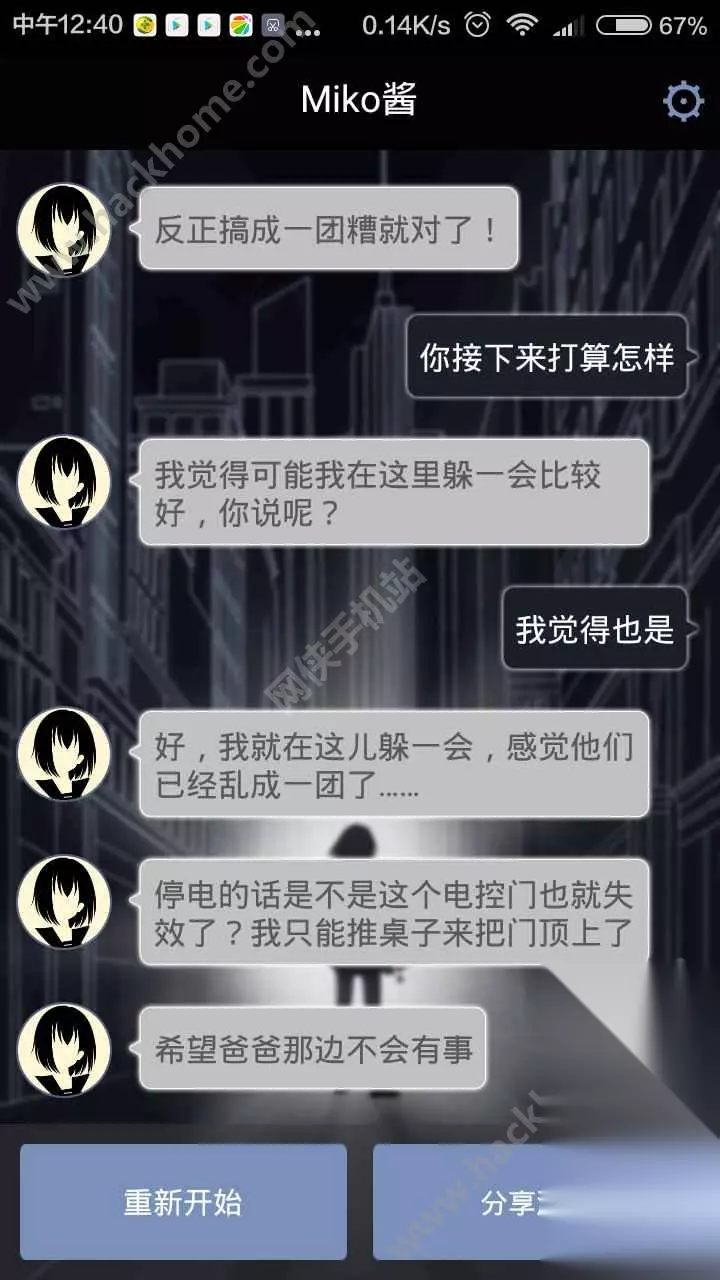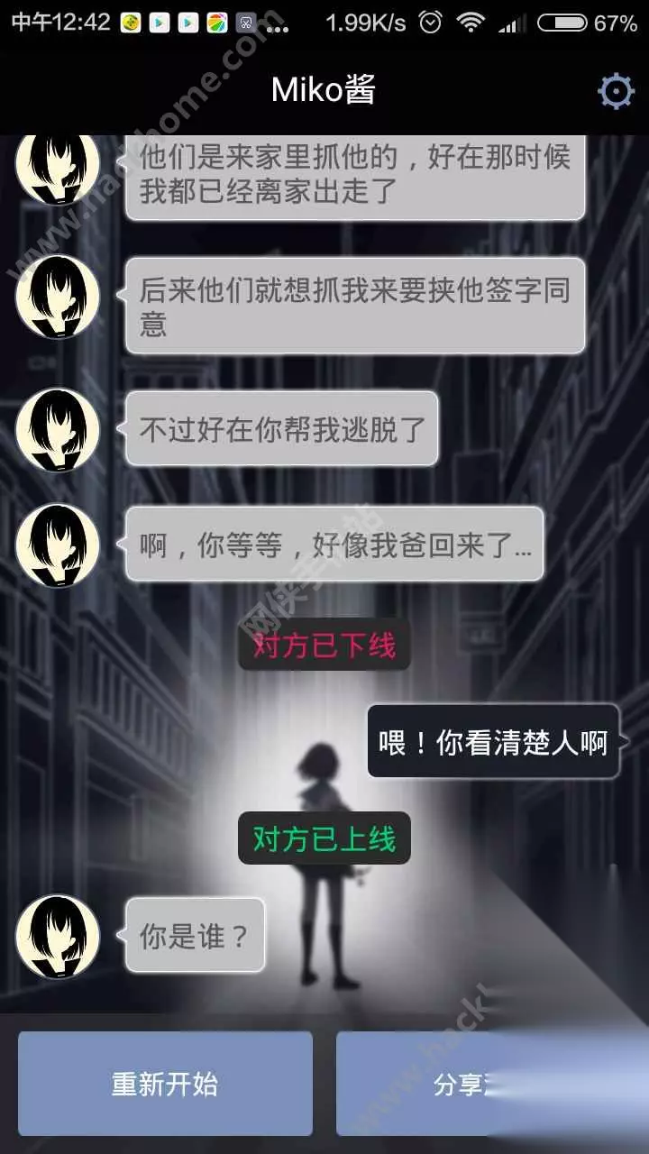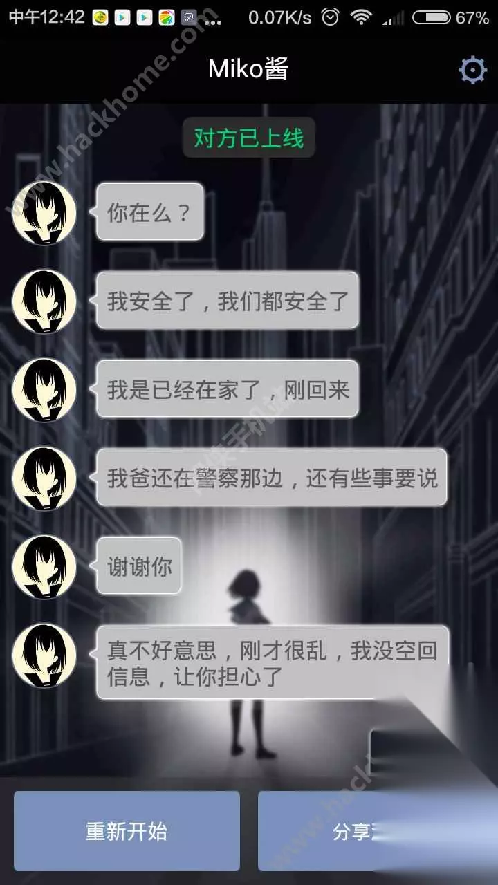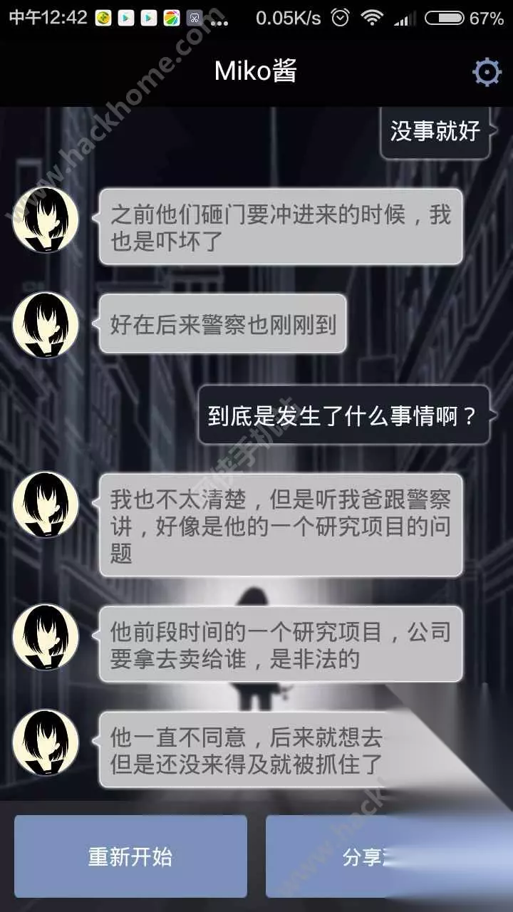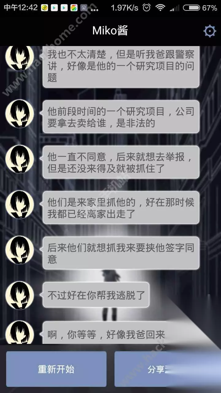 游戏的过程大致分为三天: 第一天从miko找你开始,到天台睡觉位置; 第二天miko回家,决定要去就你爸爸; 第三天救你爸爸的一天; 第三天特别容易死,第一天和第二天怎么样都能回到主线,所以不用太过担心; 然后要注意了: 首先锁,一定不要让miko留下,让她回到会馆,不然会被保安抓住; 其次是密码,选择第二个,哪有8选哪个。就算错了miko也会给你提示; 接着监控室,要选择进去; 然后路过42号房间的时候要留下来; 救爸爸的时候不可以冲进去,而是选择踢门进去。 最后,和选择密码一样,miko会给你提示,待在配电房不要出来; 正确选项是在这里躲一会等警察叔叔来救你。 如果你选择说要跑出去的话,妹子就会用各种各样的说辞来告诉你那么很危险,你还有一次还是两次可以选择的机会。 如果你执意不听妹子的话,那妹子就会听你的,跑!然后她就被抓住啦,然后就会显示账号已注销,游戏结束。