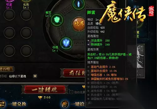 【装备星魂有窍门 境界提升实力增】 当侠米们通过猎魂、提升星魂等级等方式拥有钟意的星魂后,就能把它们装备在命宫之中、为自己的实力带来飞跃式的提升。需要注意的是,侠米们只能在命宫中装备赤宵、翎羽或紫阳这三类星魂的其中一类而无法混装——想要增加攻击就首选赤宵系,想要附加攻击效果则选择翎羽系,而想要提升防御与生存力就使用紫阳系吧! 当侠米们在命宫中装备5个或5个以上的绿色星魂时便能开启“境界”特效,为侠米们额外提供攻防等属性的提升!当境界效果升级后,所提升的属性也会增加,除了星魂等级外境界等级的培养也不要落下咯!