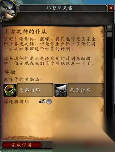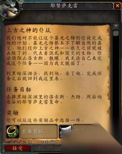 2、然后我们去黑暗深渊副本当中击杀洛古斯杰特。 3、最后回来交任务,奖励巨拳指环和栗壳衬肩二选一。