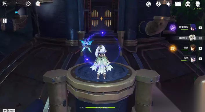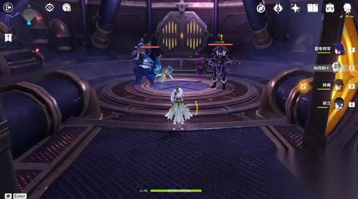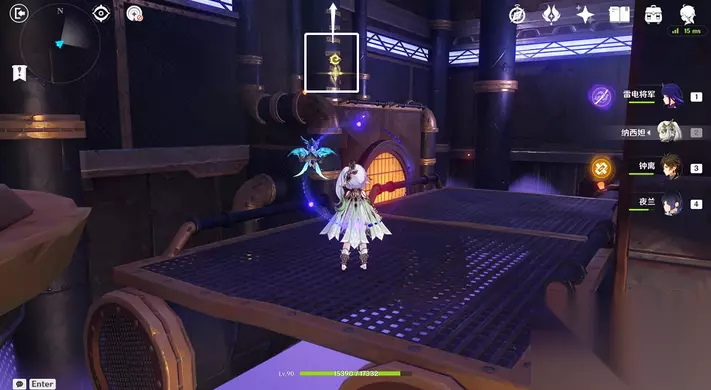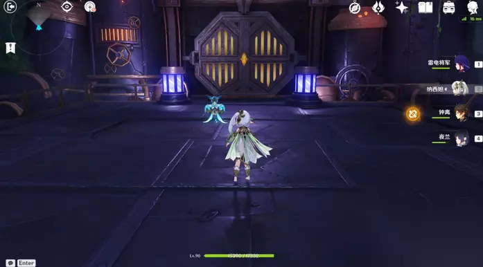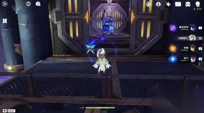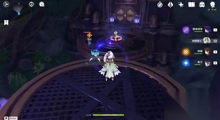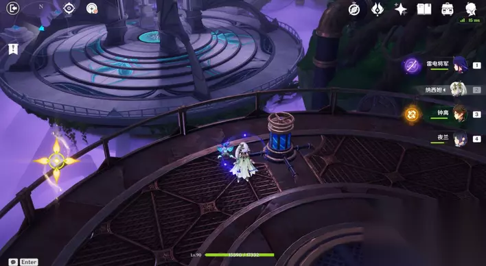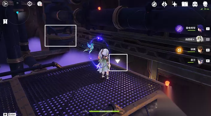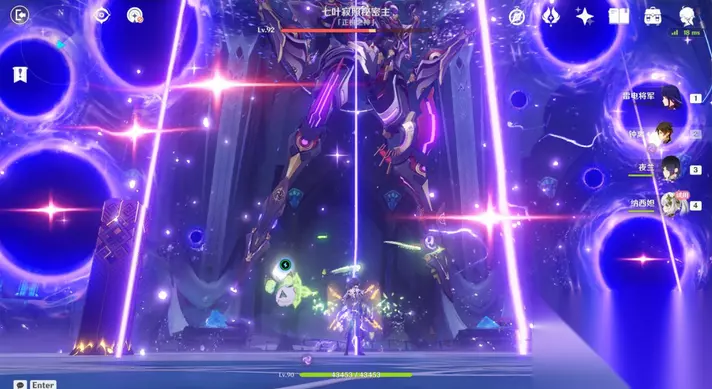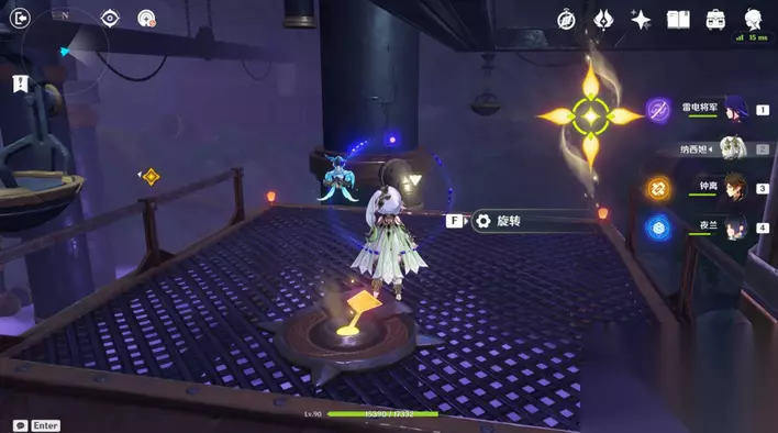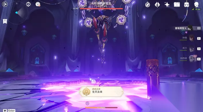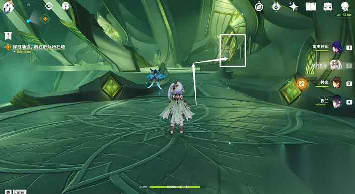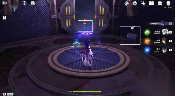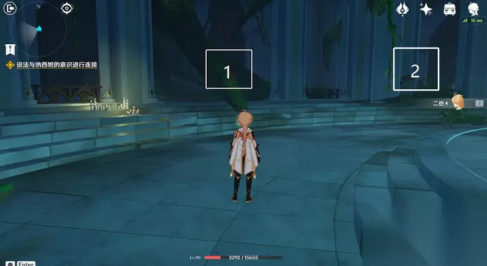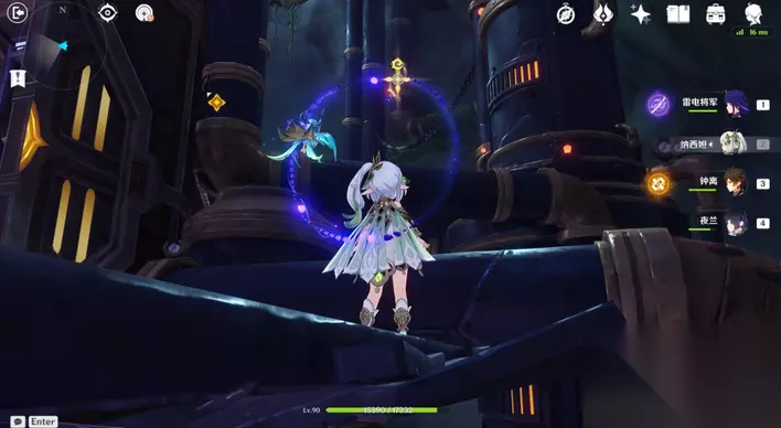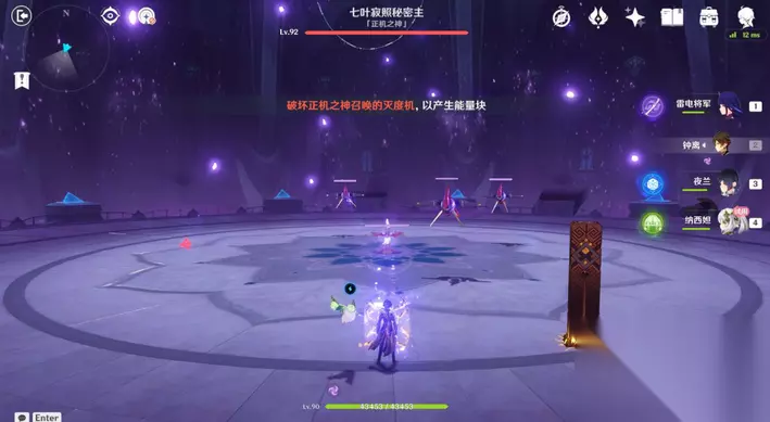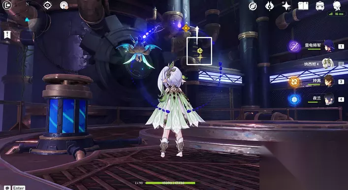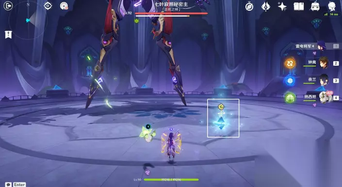 35、站小精灵周围可回血。要一直拾取图中能量块,2个能量块可激活1个元素矩阵。激活左右两边雷元素矩阵,使其瘫痪,获得成就「落落磊磊」。击败「七叶寂照秘密主」阶段①,观看动画。