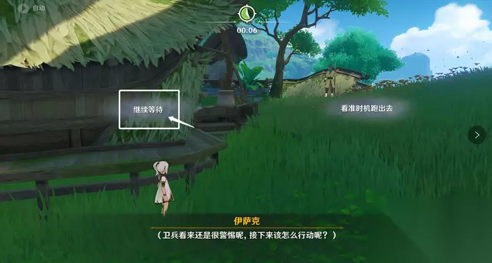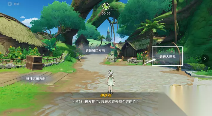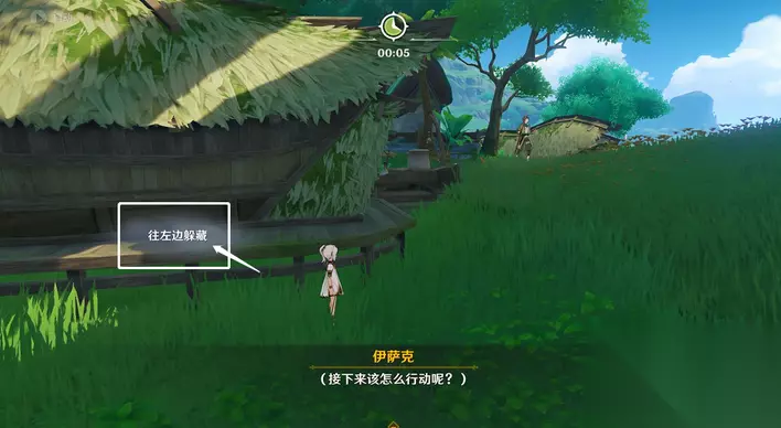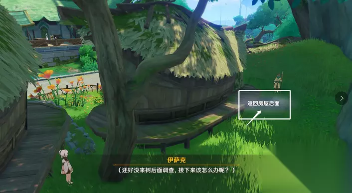 16、伊萨克假扮小吉祥草王,选择「躲在房屋后面」。