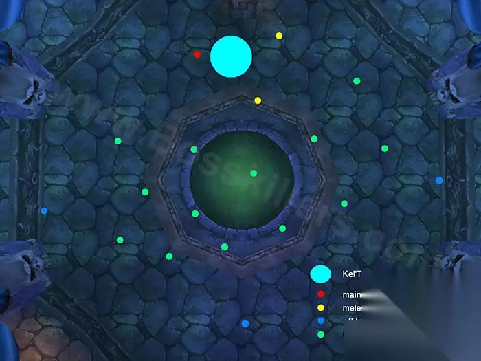 上图中青色大点是克尔苏加德,坦克在红点,黄点是近战组的集中位置,其余成员分散站立。 由于克尔苏加德的受打击范围很大,坦克和两个近战组三角形站在三个点上是最好的方式,最大限度减轻了冰霜爆震的威胁。注意,千万不要把冰霜爆震传染给坦克,4秒40k伤害可不好玩…… 不断的打断霜冻箭是这场战斗的关键,极大地减轻了坦克的治疗压力。普通难度下可能需要一个事先安排的打断循环,英雄难度下由于你有充足的人手,不必太刻意安排,让他们自己调谐即可。不过,最好还是安排两个人专职打断,好让其余成员安心地全力输出。 其余所有的远程职业,各自找好地点开始输出,记住互相离开10码以上!若脚下出现暗影裂缝,立刻跑开,但是请看好你跑的那个方向上是否正好有被施展引爆魔力的成员! 治疗方面,保证坦克存活的基础上治疗全团,应该不会是太困难的事情。 细节战略 普通难度:一个治疗看护坦克。如果打断协调不好,就安排两个。其余的治疗看护全团的状况。空闲出的副坦克,如果克尔苏加德身边的三角位已经满员,那你大可站在一边看戏直到下一阶段的开始。毕竟让冰霜爆震多连一个人对治疗是很大的负担。 英雄难度:这一阶段中,看护坦克的治疗是两个,若打断协调不好则是三个。安排一两个治疗快速反应任何被冰霜爆震击中的成员,牧师的盾非常管用。空余的副坦克可以站在人群中,一减轻治疗压力,二可以快速反应被克尔苏加德控制的玩家。控制职业要密切关注克尔苏加德之链,如果发生,第一时间控制住被控制的玩家。 当克尔苏加德的HP掉到45%时,第三阶段,也是最后的阶段开始。 职业小结 近战:保持打断,不要错过任何霜冻箭。此外,英雄难度下三角点上势必站3个或更多的人,不要害怕…… 远程:保持输出的情况下,随时关注暗影裂缝,团队随时处于运动中。 治疗:保持住自己看护的范围内的团队成员,此外,如果有插件,可以借助插件快速定位并治疗受到冰霜爆震效果的成员。 坦克:如果不是主坦克,也许呆在一边看戏是更好的选择,虽然乏味,但可以确保团队的安全。 挣扎 当克尔苏加德的HP掉下45%时他会向巫妖王求救,过几秒后从周围的入口处会冲进2/4名冰霜皇冠卫士。他们不是一起冲出来的,而是每5-8秒随机从某个门中杀出一个。这些卫士的HP非常高,无法被控制和风筝,但是会在克尔苏加德倒下后撤退。 卫士出现后,每经过15秒,攻击力就会提高15%,因此这一阶段事实上有一个软狂暴计时,团队必须在卫士的攻击力变得无法控制之前结束战斗。 基本和第二阶段一样,只是多了卫士。