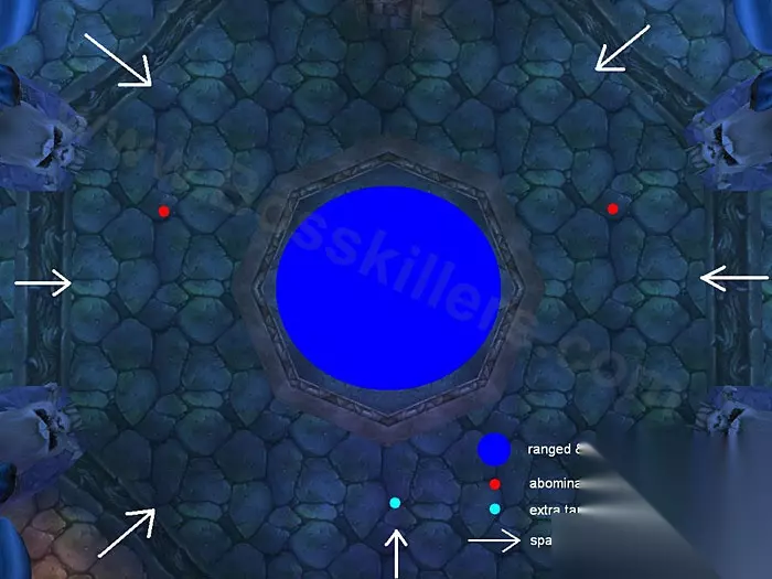上图中蓝点为团队中远程和治疗的位置,红点是坦克大概的位置,青点是25人时多出坦克的大概位置。白色箭头即是敌人的进攻路线。 战斗开始时,这排场看起来很吓人,事实上这些敌人只会一两个一两个地被激活而向你们冲过来。不要用海加尔山的战略去“拉一个门,群攻杀掉,以此类推”地打,只需在中间以逸待劳即可。 其次,不论杀敌的速度,敌人总会以一个固定的速率激活。你需要关心的只是跑来的是什么而已。此外,4分钟后,所有未出动的敌人都会撤退。 再之,在这里AoE并非什么好方法。团队应该以集火的方式点杀憎恶和灵魂编织者。 输出的顺位: 近战:憎恶 > 灵魂编织者 > 冰冻废土战士(尽量避免) 远程:冰冻废土战士 > 灵魂编织者 > 憎恶 将你的坦克安排去看守大门。如果你们有2个坦克,则一人左一人右;如果是3人,则每个人分配邻接的2-3个出口。记住,他们只需要拉住憎恶即可。 冰冻废土战士的清理可以交给暗影牧师或猎人,两者是最佳选择,一个跑来跑去丢DoT的术士也是不错的选择。 其余的输出职业比较随意,在房间里四处行动并清剿杂鱼。房间并不大,能让你比较轻松地左右跑动。没有固定站位——敌人的刷新是随机的。 房间正中的圈子可以作为集合区域。远程应该一直在这个区域以灵活应对八方情况,近战则跑出去清理敌人后回到中间等待以最小化下一次跑路的时间。此外,坦克需要将视角好好调整,尽量一次直接将自己管理的出口尽收眼底。 战斗的这一段时间比较轻松。只是最后克尔苏加德会喊话,然后走向房间中间开始第二阶段。此时请确保你们的主坦克空闲,并最快速度清理场地上残余的敌人,然后散开,迎接克尔苏加德的到来。 职业小结 近战:灵活转动视角观察情况,并寻找最近的憎恶击杀。若没有憎恶,当你确定不会抢过灵魂编织者的目标的情况下,可以去协助攻击但绝对不要抢走仇恨!其余时候,中央待机。 远程:灵活观察全场情况,保持自己是灵魂编织者的第一目标。敌人过分接近时,避让躲开。 治疗:除了坦克,其余团队成员受到的伤害应该很少。保持团队状态峰值不会很困难。空闲的话,也可以协助输出。 坦克:坦住你管的憎恶。若坦克太多憎恶或身上的重伤叠加过多,可以适当风筝以减轻治疗压力。 BOSS阶段 杂兵战过后,克尔苏加德移动到战场中央,正式开始和团队交锋。
