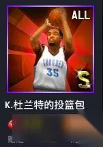 分析:将安东尼投篮包放到冷门动作包盘点中,我个人感觉还是稍欠考虑,但是安东尼投篮包在组合包出现之前在游戏中使用率也不是很高,但是在组合包出现后,其出现在玩家视线中的频率也是有较大的提高,安东尼投篮包拥有较为出色的出手速度、和出手节奏感。对于许多玩家其跳投动作用的会非常顺手,另外在其其他动作中安东尼投篮包的变形投篮和漂移投篮动作都实属上层,其左变形投篮尤其出色,有很好的后仰幅度、出手感觉和出手速度。其左右漂移投篮的动作,在起跳高度上都有非常大的优势,抗干扰能力十分的强,出手点也是比较的好找。 4.杜兰特投篮包