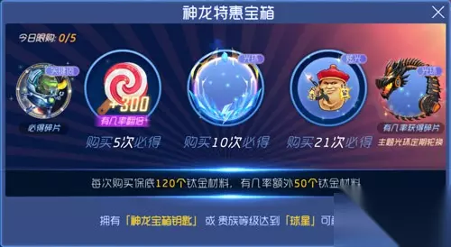 本次开启时间 9月5日~9月9日 神龙特惠宝箱怎么解锁? 这次宝箱不能直接使用1200个金蘑菇直接购买了,需要贵族等级达到“球星”才可解锁神龙宝箱! 开出材料详情 奔跑的霍噜本哆关键词碎片(必得) 棒棒糖300个(购买5次必得) 圣域光环(购买10次必得) 人走,球留下炫光(购买21次必得) 机械神龙光环(几率获得碎片)