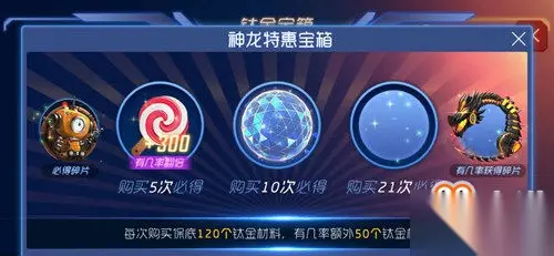 神龙特惠宝箱 出售价格:1200金蘑菇 限购次数:每日5次 出售时间:2017.8.5~2017.8.9 PS:每次购买保底得120个钛金材料,有几率额外获得50个钛金材料。