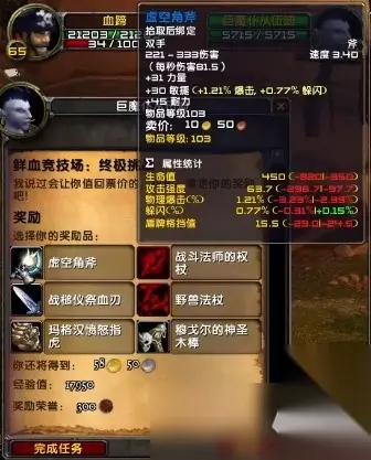 在魔兽世界这款游戏中,鲜血竞技场任务的最终奖励是一把物品等级为103级的蓝色品质武器。玩家完成任务后,是在六把物品等级为103级的蓝色品质武器中选择获得一把。六把蓝色武器分别是穆戈尔的神圣木棒、战斗法师的权杖、野兽法杖、虚空角斧、战槌仪祭血刃、玛格汉愤怒指虎。