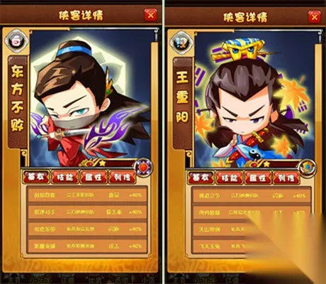 我们可以看到,橙色卡牌的三围属性几乎是紫卡的一倍!如此巨大的差距,决定了橙卡在今后的战斗中将占据绝对的主导地位! 大多数玩家在积极激活基友组合属性的情况下,都选择了性价比最高的“四橙两紫”侠客配置。如今,在橙卡的属性是紫卡一倍的情况下,全配六张橙卡在战斗中绝对完胜“四橙两紫”的搭配。毕竟,激活基友组合将获得的属性百分比加成是单一的属性加成,且基本上都不超过50%,而使用橙卡则可以瞬间获得一倍的三围属性提升,孰优孰劣一目了然。 最后,告诉大家一个惊人的发现,东方不败、扫地僧、独孤求败和王重阳,这四张至尊橙卡的三围属性也几乎是普通橙卡的一倍!再加上至尊橙卡之间的强力基友组合,如果能凑齐至尊卡的话,相信大家实力绝对会有一个质的飞跃!
