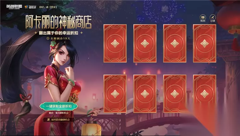活动内容: 1. 召唤师首次登录活动页面,可免费翻开8张卡牌,每张卡牌可以获得1款皮肤及该皮肤的折扣价格。 2. 在翻出来的8款皮肤中购买至少1款皮肤,即可额外获得1次重新翻牌的机会。重新获得8款皮肤和折扣,再至少购买1款还可再获得1次重新翻牌机会,依此类推。 3. 拥有神秘钥匙的玩家,可消耗钥匙获得额外1次刷新机会,神秘钥匙在同一大区仅可使用1次。 4. 如果召唤师背包中的道具较多,神秘商店推荐的道具可能出现已拥有道具的情况,为感谢您对英雄联盟的支持。已拥有的道具支持购买到其他大区,并可以同样获取额外翻牌次数。 5. 使用“额外翻牌次数”刷新道具推荐后,原本页面的8个道具将会失效,不可再购买。本次活动额外可获得总刷新次数为10次。