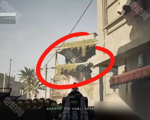 3、继续前行,过高楼时右侧带有植物的建筑上有一个火箭筒兵
