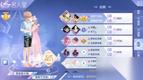 图4:心动值怎么获得 另外QQ炫舞手游中的名人堂,还有属于情侣的心动值排行榜,玩家可以看到当前大区的情侣心动值的名次。情侣间的心动值还是比较难获得的,记得每日去完成获得情侣之间的心动值任务。