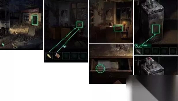 6、开门进到屋里,点击烛台,放入焟烛,用打火机引燃,再点击桌上的抽屉得到润滑液,润滑液对钱箱箱门应用,得到冥币。