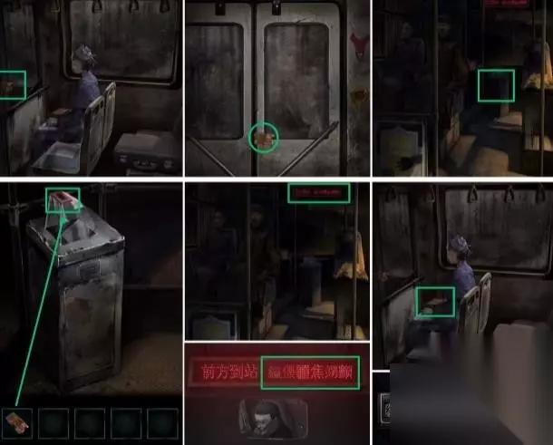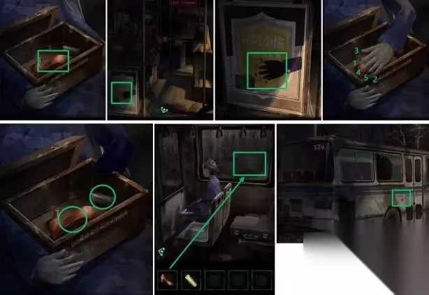 2、点击盒子,点击高跟鞋,依照【食指、小指、拇指、中指、无名指】顺序扒开女人的手,取得高跟鞋和焟烛,再用高跟鞋砸烂车窗,逃离公交车,随后点击紧急开关按钮,车门打开。