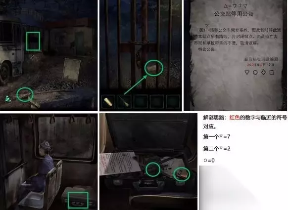3、去小屋子那边,取得扫帚,点铁门,去扫帚去勾里边的纸头,得到公交站停用公示,根据上面的提醒(△=▽+▽也就是2+7=9,○=0,◇=8,□=1),打开密码箱,得到火机、红圆珠笔。