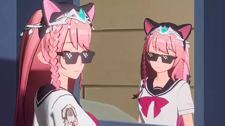 你们快看镜子不动,只有旁边那个会动,她好漂亮,粉色的头发戴着猫耳朵,戴着墨镜,穿着校服衣服,可美丽😍😍😍