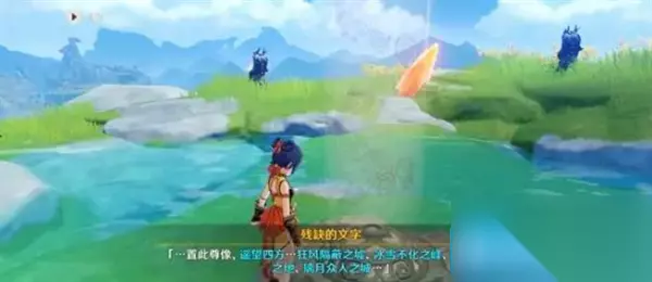 5、触发机关获得文字提示“置此尊像,遥望四方,狂风隔蔽之墟、冰雪不化之峰、绝云隐仙之地、璃月众人之城”,对应游戏中多个地点,点亮地点对应方向的岩尊像即可;