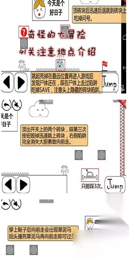 奇怪的大冒险第4-1关怎么过 1、进入游戏后,顶到头上的砖头后,迅速向左移动,否则会被刺扎死。 2、 跳上砖头,死在差不多远的地方。 3、然后再次进入游戏,这时你会发现刚才死了的主角会停留在陷阱上,不要犹豫踩在他头上然后再次起跳从而跳过陷阱(这里有必要提一下,如果死的比较远的话 跳起来会有一个隐藏砖头,砖头有一个食人花不利于通过,所以这个位置可以通过且不会顶到它)。然后就可以“SAVE”了。 4、“SAVE”后跳到控制台上,这时对面的一竖排尖刺陷阱就会消失,把控制台上把左右两边的隐藏砖头都顶起来,不过需要注意的是 控制台只能踩1-3次然后就会消失,如果控制台不消失的话当你跳过去尖刺陷阱就会突然出现秒杀主角。所以方法就是每踩一次就迅速跳到砖头上去,直到控制台消失。 5、跳上砖头跳到对面,捡起地上的“NIKE”继续向前走,这时后边会出现一只巨大的草泥马(草泥马移动速度太快了,小编没来得及抓图请各位见谅)。不要怕,直接撞死他(这里小编有必要提一下,如果在刚才的控制台没有顶到左边的隐藏砖头话,这里就会被秒杀)。当撞死草泥马的时候就可以迎接心爱的公主了。
