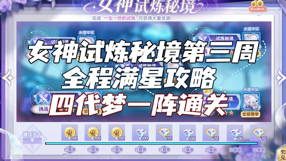 这是奥拉星女神试炼秘境第三周的一次性通关攻略,展示了不同关卡的通关目标,包括回合、阵容评分、亚比类型限制等要求,还呈现了对应通关阵容及战斗过程,助力玩家达成战斗胜利。