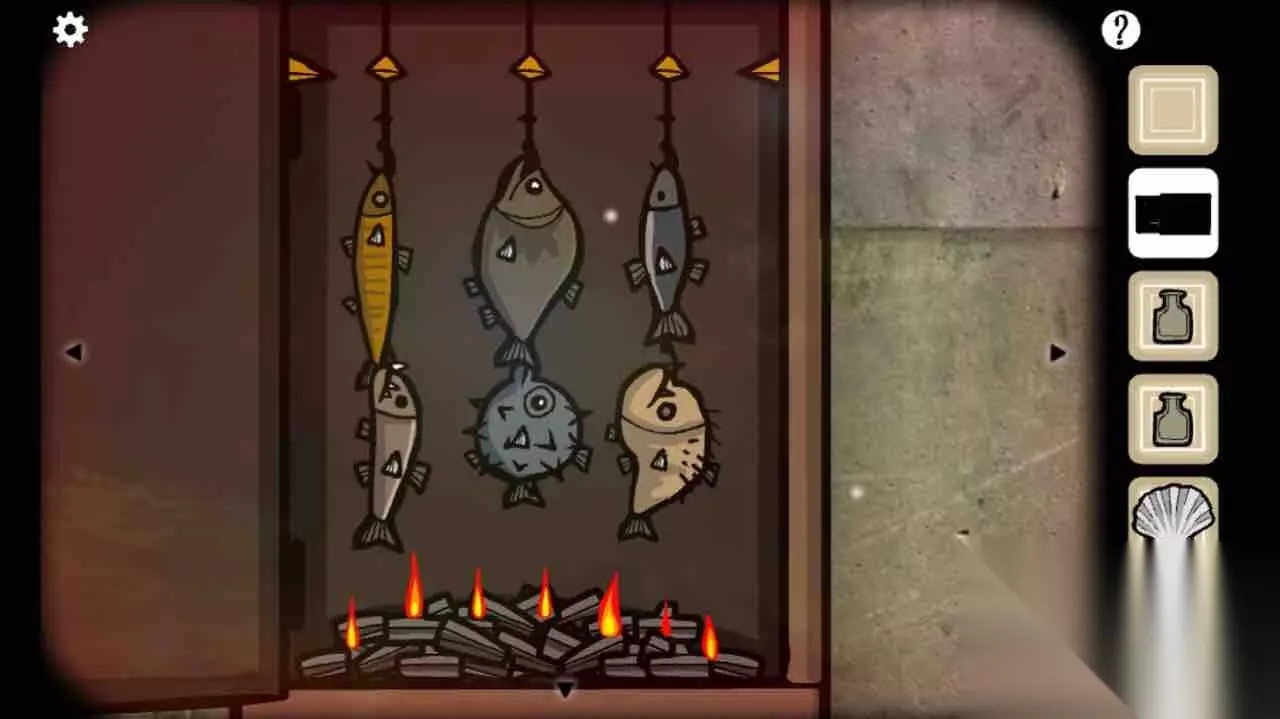 第11关 第四幅画,根据三条橙色鱼的指向顺序点物体(颜色顺序是黑、浅蓝、白、红、深蓝、金),墙上出现裂缝。