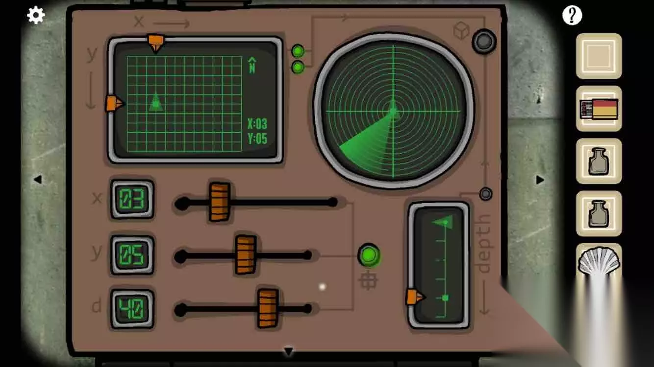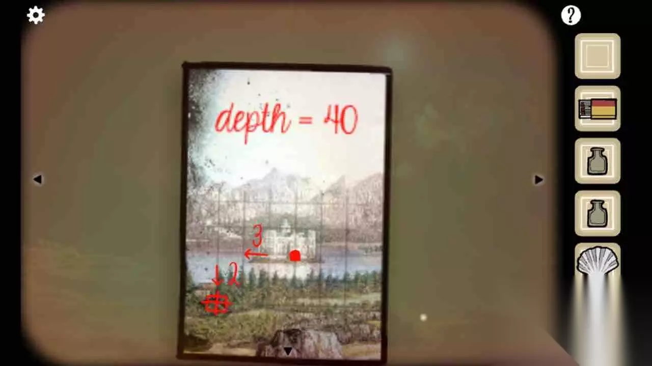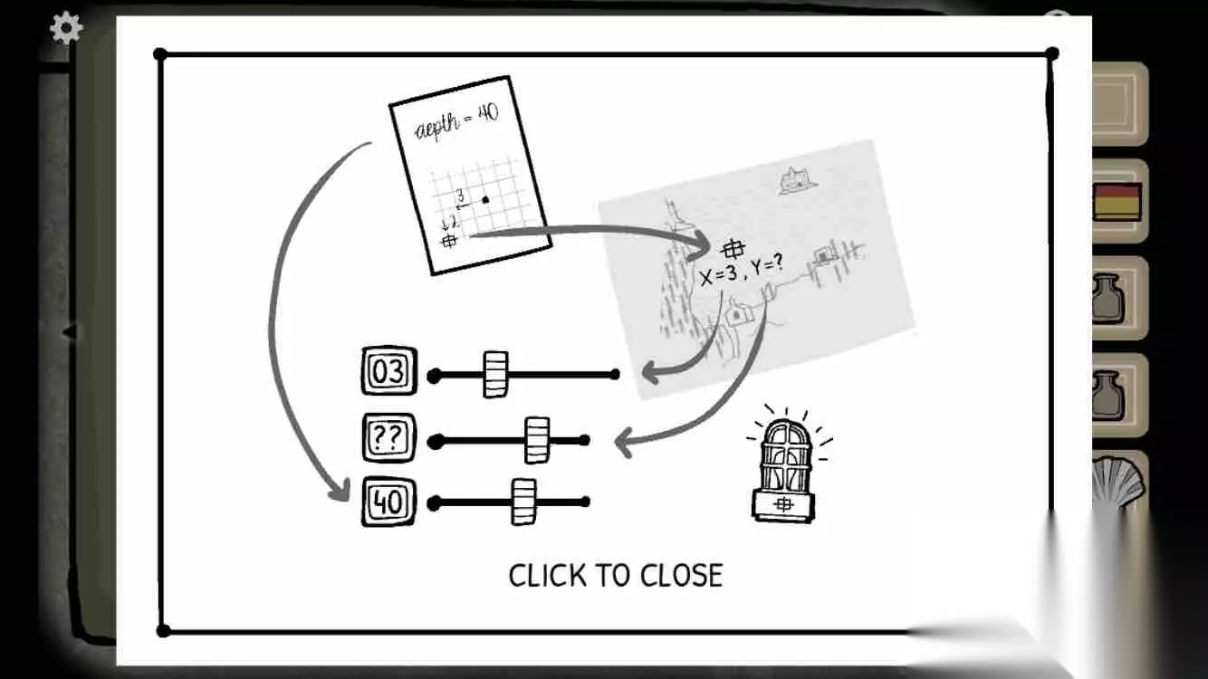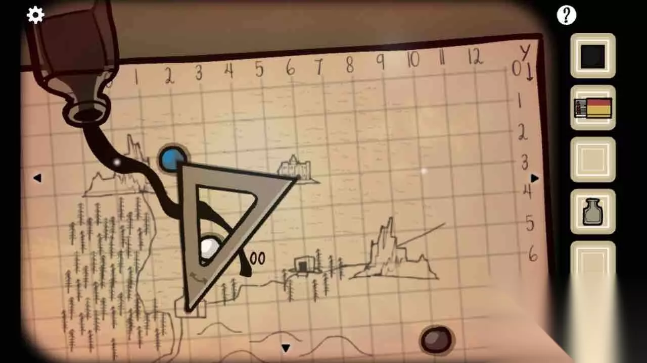 在桌子上捡起贝壳、墨水瓶,根据桌上的图纸和大航海图(在hotel西边三格、南边两格),确定第一个坐标点为x3、y5、d40。