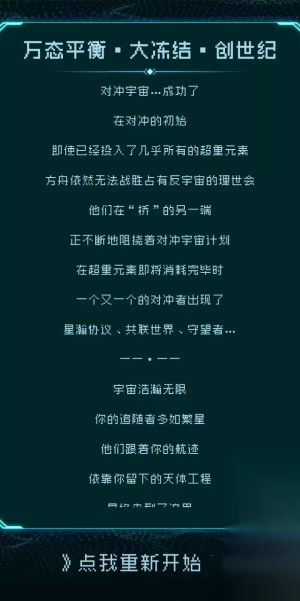 也许除了最后榜上有名的三位 星翰协议 共联世界 守望者的星球以及不攻击他们,其他的是否吞噬和攻击都不会影响创世纪?如墨文明。废土后面也没戏份了,追光者据说即使远离了后面也会打击方舟(但到我跑了也没见到)。大概最后只要保有星翰协议、共联世界、守望者这三个条件,就可以创世纪结局吧。 我全选的共生,除了最后那个看门者一炮没轰,但唯独没有选机械嬗变,结果对冲失败了,并且没有人来帮忙
