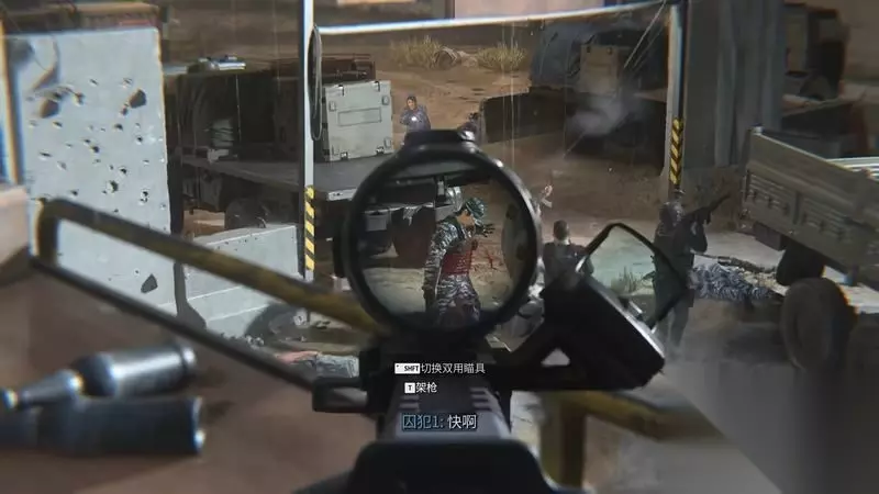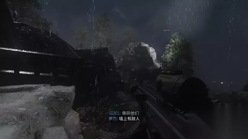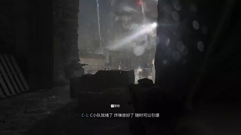 进入监狱中庭后,在掩体后等待另一只小队引爆炸弹制造混乱。 无需关注对面靠墙铁丝网附近的敌人,留意近距离的敌人就行,爆炸后只有靠近己方这几个敌人会幸存。
