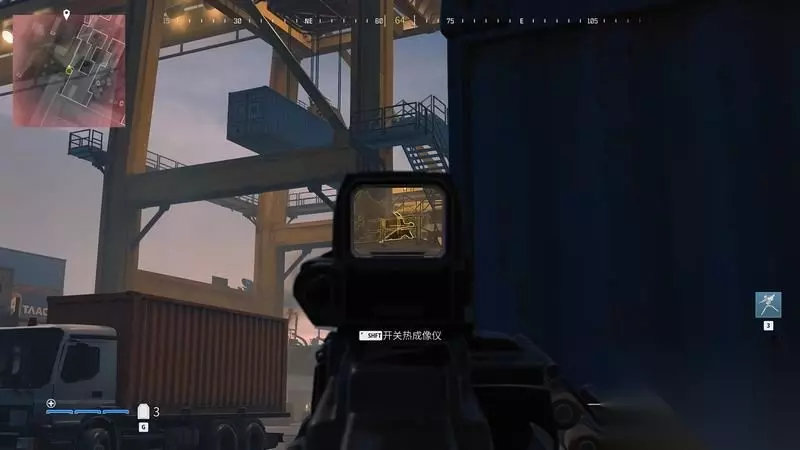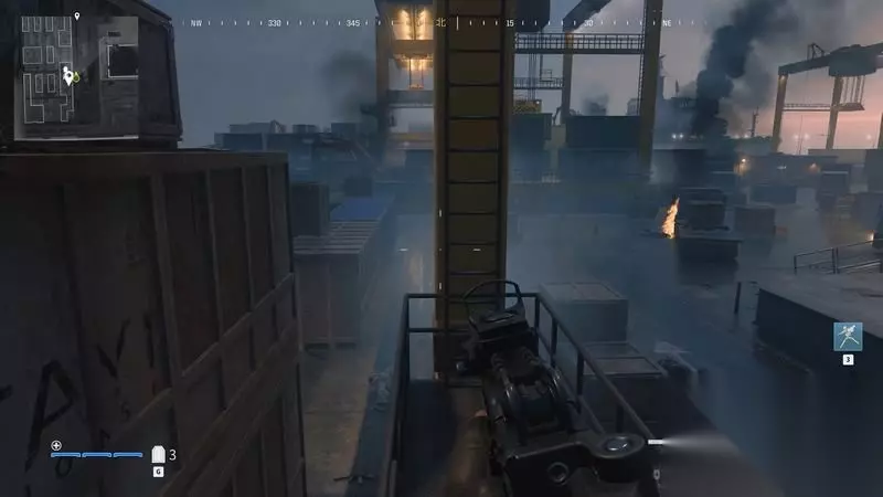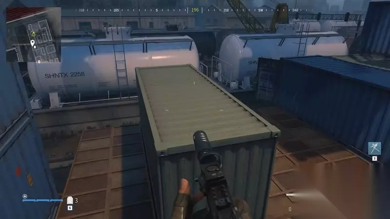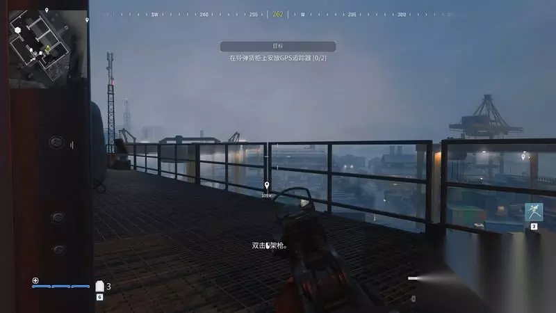 跳到集装箱上。 尽量爬高点,方便找位置,也方便清理附近的敌人。