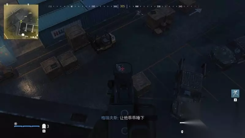 本章为开放式作战,也就是类似在线对战的那种地图模式,玩家可以有自由的行动路线安排。 可以选择潜行或者大开杀戒,不过说实话战役模式这样搞感觉多少有些不伦不类(笑)。 注意地图上的白色坐标点,躲开集装箱上警戒的敌人。