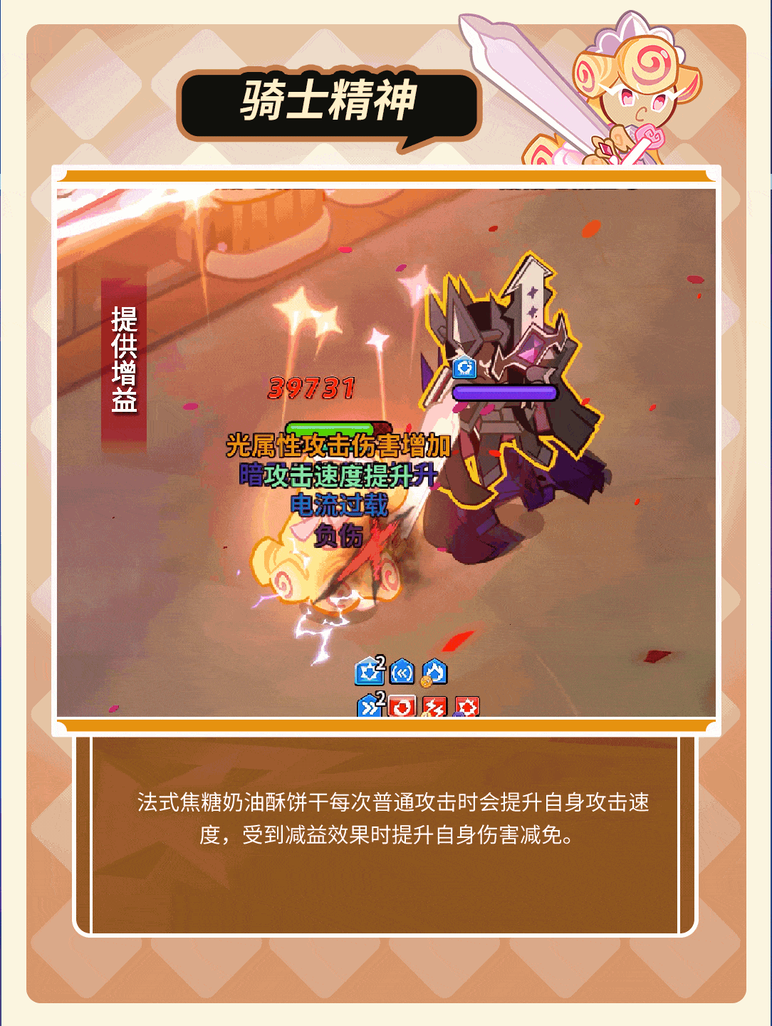 发动技能强化普通攻击,增加攻击范围,为己方饼干提供光属性攻击伤害与降低攻击速度抗性的效果,同时为攻击速度最高的两个饼干额外增加攻击速度,技能结束后,挥动光之力量对敌人造成伤害。法式焦糖奶油酥饼干每次普通攻击时会提升自身攻击速度,受到减益效果时提升自身伤害减免。