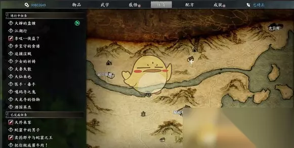 4、客栈对话之后,接找剑任务,这个时候先把以简御繁点出来,然后一起杂七杂八的成就点了可以升好多级,接完去加了段,拿了成就T了他,出村去找骆,招骆之后T了他,拿到成就,黑皮任务接了,往左走,喝水的地方喝3次得到天山雪莲(这里还有一个天选之人称号,加野球拳输出,拿不拿无所谓)。接下来你可以去做主线,或者往北走去藏花草棚,招了程妹子,天煞孤星直接拿了她武器然后T了。坐马车回到拱石村,做灶神任务,要轻功(必须拿)放了他们(赶走他们的话,他们会被流寇砍死)做完这些顺便去村口把李子给采了,要5个,做完去黑寡妇抓了,你可以拿到好多个猪肉猪黄,不用刻意去打野猪。然后晚上去村外那个草堆上把东西捡了,空格踩三下可以打鸡神……新手村任务不再赘述,注意客栈睡觉如果拱石村好感够可以接到挑战书,得刀法。另外打完蛇窟回村,村长给个钥匙(有时候不给,所以建议开局选五毒,这里蛇王给郎中),后山开启,回来后去看族谱+轻功。拱石村牛任务给一个暴击饰品,新手村有个加500血的饰品具体位置。