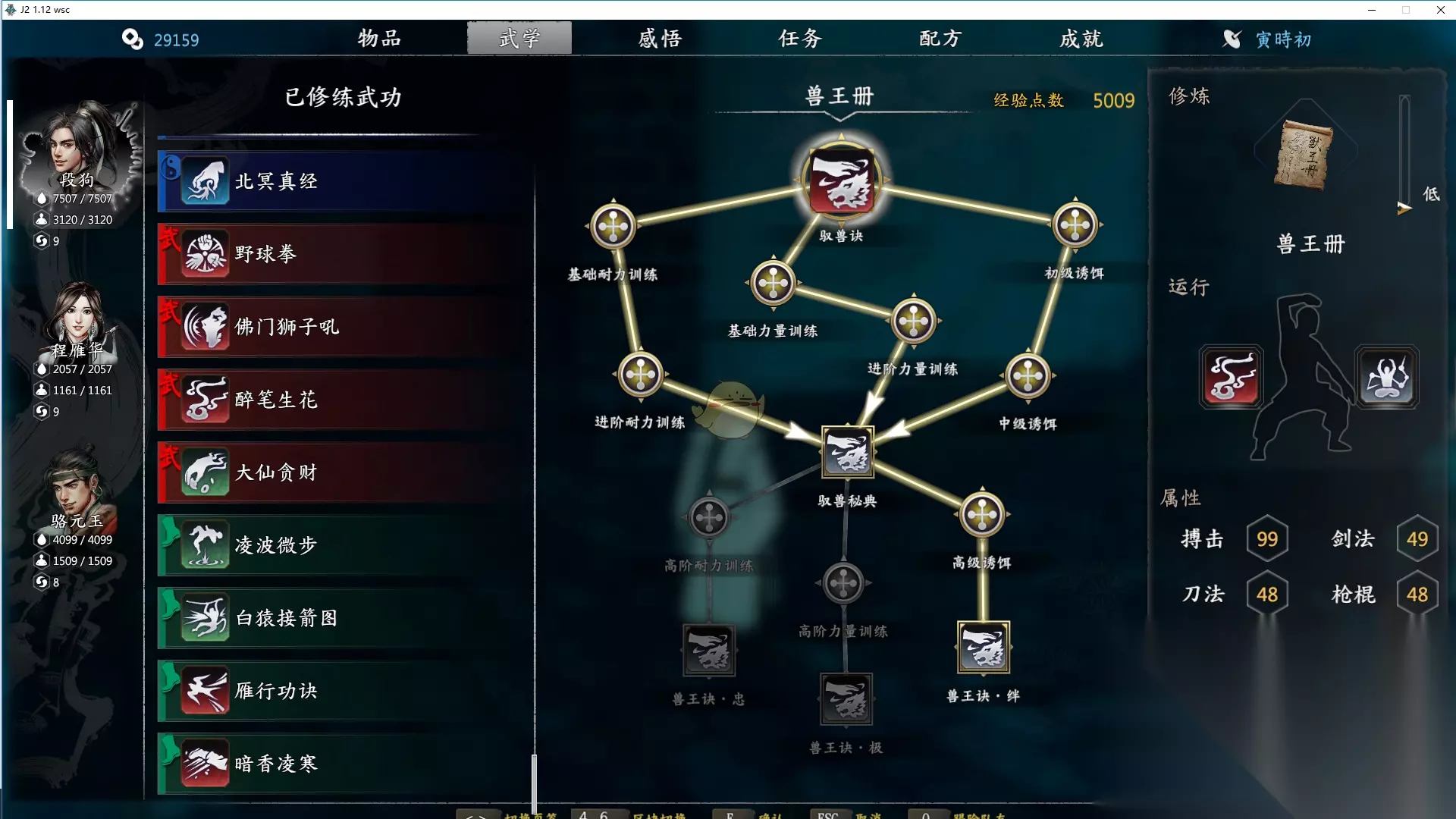 35级之后带兽王诀练满,带只狮王,就可以去上面说的迷魂水寨练级了,这个任务注意和大当家对话两次之后,挨个和兄弟们对话,最后和女的对话两次,直到拿到内功为止。然后就可以无限陪他们练手了。这是我所知道的经验最多也是主线结束后还能继续练级的地方(明教洞和村庄流寇等均已不能),这个地方等级略高,建议内功属性超过200带上颜玉书再来(入颜妹子之前建议先把百损任务做了,逼死张君宝,晚上一直摸百损颜玉书会吃醋跑掉再也不回来了,后宫线百损也是关键人物) 完美档评测:35级成型,此时应血量7500+,搏击100,内功150+,轻功100+,百烈护手+玄铁剑,拙系满静系22点,有地贼护腕+紫色玄铁锁子甲,三个队友洗髓经全满(洗髓经注意练满再运行,加成长血量,比正常高150左右)。建议:玄铁剑:吸血+绝龙骨(或金刚石)金乌刀:吸内+冰封 百烈护手:吸内+吸血 冷艳锯:吸内+绝龙骨击退时序(或吸血或翡翠) 神农:紫色冰封+绝龙骨(或蛇毒) 注:称号前期用天煞孤星,中期用河洛大侠,后期用天煞孤星。颜玉书玄铁剑+金乌刀(乌精刀),内功离合参商,饰品戴雪翼雕之羽,走动-巧-静流派,巧点百花齐放,点满百花缭乱,后期可以太白飞剑+婵娟一剑+百花缭乱,刀剑归真也可学着玩。骆大爷就动-刚点满,带地贼护腕,学龙啸穿云枪(配套紫色武器,无法镶嵌),内功选择桃谷升仙诀;奶妈由于药王神篇为专属,内功带太阴寒冰诀/告哀乞怜诀/先天功/太清罡气等,可以把手套打满debuff偶尔用用,柔-静-拙,饰品戴加生命值即可;若不选择奶妈选择百损,内功太阴寒冰诀,饰品戴寒玉镯,可以医毒双修,药石野集比药王神篇回复差了一半,等于队伍放弃了高额回血,此时两块吸血石头需要给到主角和颜玉书。主角的话当然是拙-静-柔点满咯,领悟斗转星移,百烈护手+金蛇剑,紫色冰蚕丝软甲,饰品戴翡翠冰心玉镯等防御向饰品,招式就斗转星移+真野球拳+六路剑指+离合参商。(切莫忘记白虎妹子也是后宫之一且是死心塌地那种,带着百损就不能干好事否则她会说你,想要后宫结局就二周目加入邪线大营吧) 附10天-35级属性图