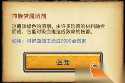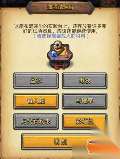 6.出来后点选血腥试验台放上圣水、毒液、马鞭草、月光石粉末(不用依照顺序,重复两遍) 会拿到两个血族梦靥溶剂