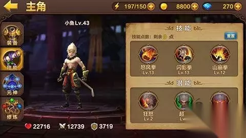 主动: 怒风拳:快速攻击前方目标,并使目标浮空。 闪影拳:制造幻影攻击并推进前方目标。 山崩拳:攻击四周目标,造成伤害的同时击飞目标。 潜能: 狂怒:战斗中增加暴击几率,触发暴击后,能增加1.5倍暴击伤害。 超绝:提升自身最大生命值上限。 嗜血:每次攻击如果触发暴击可以恢复一定百分比的最大生命值。 修炼天赋:
