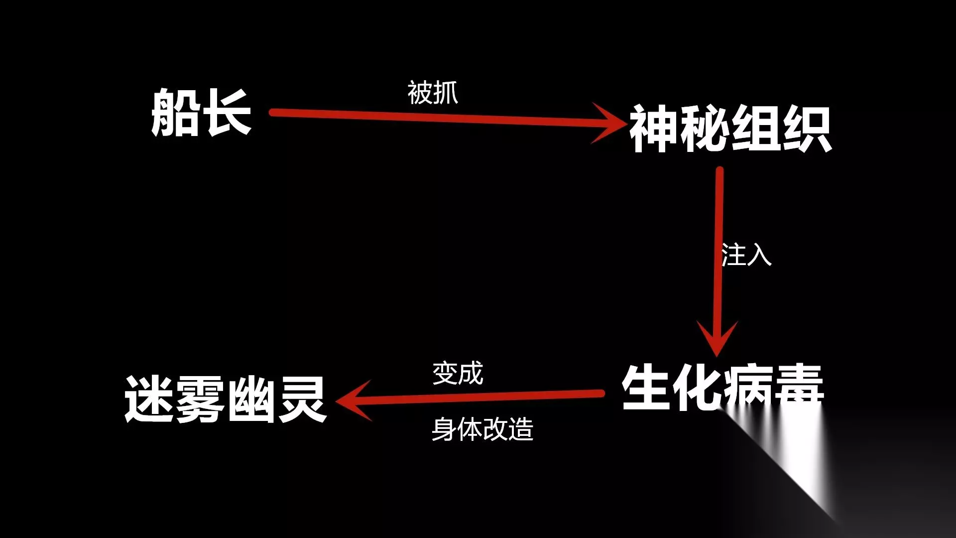 很有可能是这样的,一名船长被神秘组织给抓住了,这个神秘组织将其注入了生化,并且对他的身体进行了一次改造,为他加装了一种可以喷洒迷雾的装置,在生化的影响下,他变成了迷雾幽灵,嗯,这样解释迷雾幽灵的来历,想必就不难理解了吧,大概率迷雾幽灵是某个组织搞出来的产物。