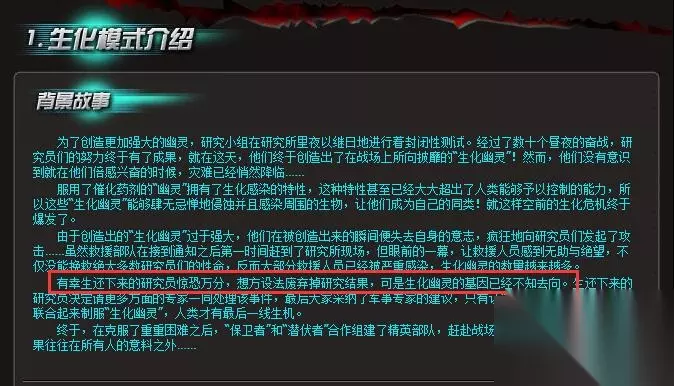 大家注意一下在生化模式的背景故事,在故事中,提到了这么一段话“有幸生还下来的研究员惊恐万分, 想方设法废弃掉研究结果,可是生化幽灵的基因已经不知去向了”,很有可能,这种生化幽灵的基因被人给拿走了,并且后来还注射到了迷雾僵尸的身上。