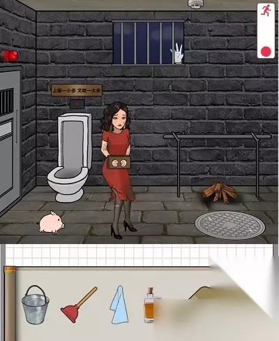 二、解救大嫂 1、点击红外线 (马桶上方) ; 2、拖动马桶搪子到马桶; 3、拖动水桶到地面; 4、拖动创可贴到伤口上; 5、拖动毛巾到马桶; 6、拖动湿毛巾到大嫂; 7、拖动木棍到柴堆; 8、长按木棍; 9、拖动酒杯到火堆; 10、警报响的时候再拖动锤子到枷锁上; 11、拖动小猪到马桶; 12、拖动大猪到架子上; 13、拖动烤乳猪到大嫂; 14、左滑井盖; 15、将鱼拖到井内。