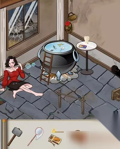 四、大嫂的假期 1、拖动胶带修复玻璃大洞; 2、拖动锤子到凳子,获得木材; 3、拖动木材到烧烤架; 4、拖动火柴到铁锅和烧烤架点火; 5、拖动木材堵住老鼠洞; 6、拖动毛巾到大嫂身上擦净灰尘; 7、点击窗帘拉上窗帘; 8、拖动肉到烤架上; 9、捞网把水里的物品捞出去; 10、给洗澡水加上玫瑰花瓣; 11、把人拖进铁锅里; 12、把烤肉拖给大嫂吃掉; 13、拖动可乐到杯子; 14、拖动冰块到杯子; 15、拖动杯子给大嫂; 16、拖动手机给大嫂。