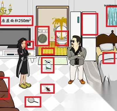 七、昂贵房租 1、拖动透视镜,查看“床角”,出现老鼠; 2、再查看“床中央”位置,点击出现的弹簧; 3、点击床边的“插座”; 4、查看“窗帘”,点击远处的“山”; 5、查看“空调”,是老式空调; 6、查看“门”,然后点击坏了的“马桶”; 7、点击最下方的“柜子”,再点击“蟑螂”; 8、点击“冰箱”里的食物; 9、点击电视机下方的“无线网”; 10、点击厨房灶台上的“砂锅”; 11、然后点击掉下来的“灯”; 12、点击电视机上的“新闻”; 13、点击左下角的“智能音箱”3次。