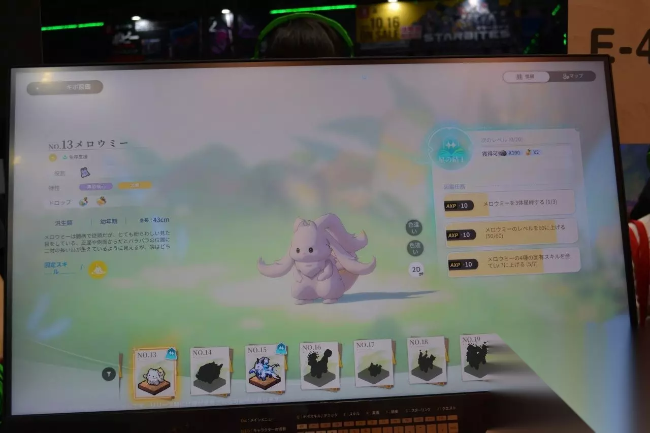 为供参考,这是BiliBili World 当时的照片,这位就是忒拉拉。 另外,在角色选择画面中显示技能性能或个人档案时,每位角色都会摆出不同姿势,十分可爱。由于动态效果很难用静态图片呈现,会场播放的角色介绍影片中登场了许多本次试玩无法使用的角色,也一并介绍给大家。 接下来介绍本作中极为重要的存在——奇波。对场上生存的奇波使用卡片后会触发「星结」,成功就能让它成为同伴一起战斗。奇波不仅会自动攻击还拥有专属的主动技能,仅仅编入队伍就能成为可靠战力。
